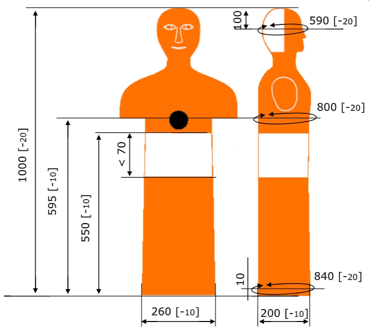 Hermetyczny (tj. zdolny do napełnienia wodą, zamknięcia i pozostawania 4 godziny bez ubytku wody) z trzema otworami wlotowo-wylotowymi umieszczonymi w podstawie manekina oraz na głowie i klatce piersiowej, zakręcanymi niewystającymi korkami po zamknięciu poza obrys manekina (możliwe ręczne odkręcanie/zakręcanie)